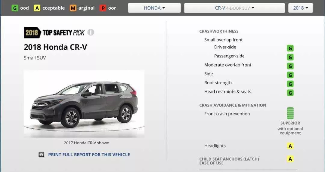 在IIHS (美國公路安全保險(xiǎn)協(xié)會(huì), 世界汽車安全標(biāo)準(zhǔn)的重要組成部分)的評(píng)選中, CR-V在各項(xiàng)安全都獲得了TOP SAFETY PICK+也就是最安全推薦的評(píng)分。