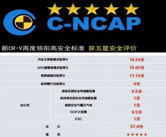 除了在美國的IIHs的測試中獲得高分評(píng)價(jià),在國內(nèi)的C-NCAP碰撞測試中CR-V也成為了優(yōu)勝者,在新的C-NCAP的測試中采用了更為嚴(yán)苛的測試標(biāo)準(zhǔn)和全新的評(píng)分體系,東風(fēng)本田CR-V仍以57分的成績摘得首批新規(guī)定測試車型的最高分,并與成績排名第二的車型拉開了4.1分的差距。
