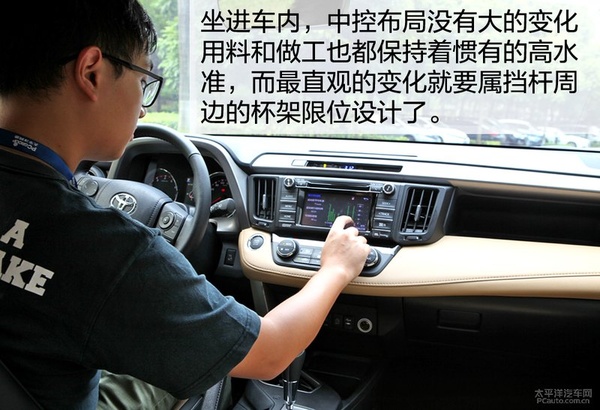坐進車內,一切都是那么的熟悉,沒有大的布局改變,很多設計都是那么巧妙、順手,這是張先生對于RAV4榮放的高度評價。中控面板當中的皮革包裹在老款車型當中就有所裝配,提升了整車質感,觸感也很舒適,這是家人都很喜歡和推崇的配置。