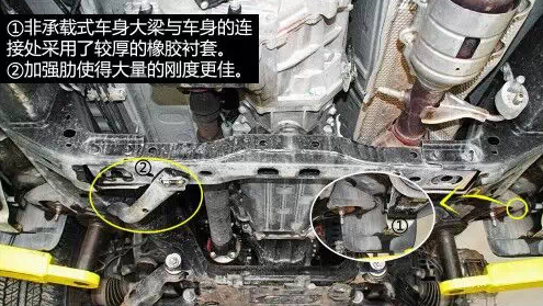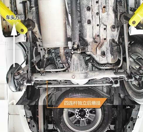 車身大梁中部有加強肋,大大提高了剛度,大梁與車身的連接處使用了較厚的橡膠襯套,慮振效果較好。油箱有金屬蓋板保護,上面有導(dǎo)流槽以及通風(fēng)孔,有利于氣流快速通過并且?guī)ё邿崃??!≈醒氩钏倨鲙Р钏冁i,為托森限滑差速器類型?!『鬄殚_放式差速器,不帶差速。前后減震支柱均為日本制造。