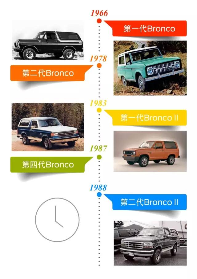 在福特Bronco三十年的生命周期里。一共發(fā)展了5代車型,分別在1978年改款Bronco,1983年創(chuàng)造緊湊級空缺的填補者——Bronco II,1987年第四代Bronco以及1988年第二代Bronco II 。Bronco系列的動力逐漸強勁,特別是1987年的第四代Bronco,引入了86馬力的2.3升三菱渦輪增壓四缸柴油機,此時已帶有燃油直噴技術(shù)。