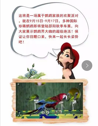 您想和紅金剛、藍(lán)金剛、大緋胸、葵花鸚鵡、大白鸚鵡、芙蓉鸚鵡.....等數(shù)十只不同鸚鵡零距離鑒賞及互動(dòng)拍照嗎?就在9月15日-9月17日,邵陽(yáng)秋季車展,我們不見不散!