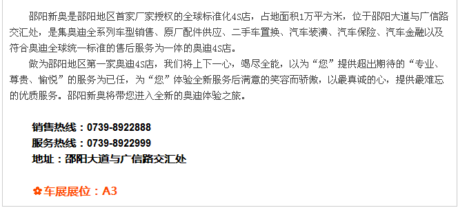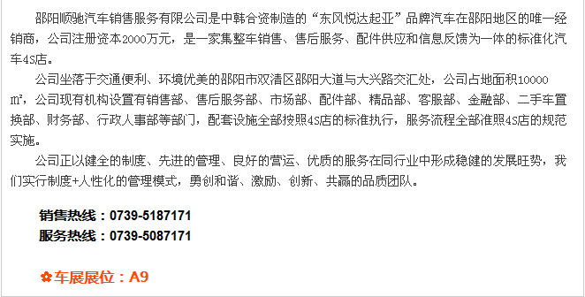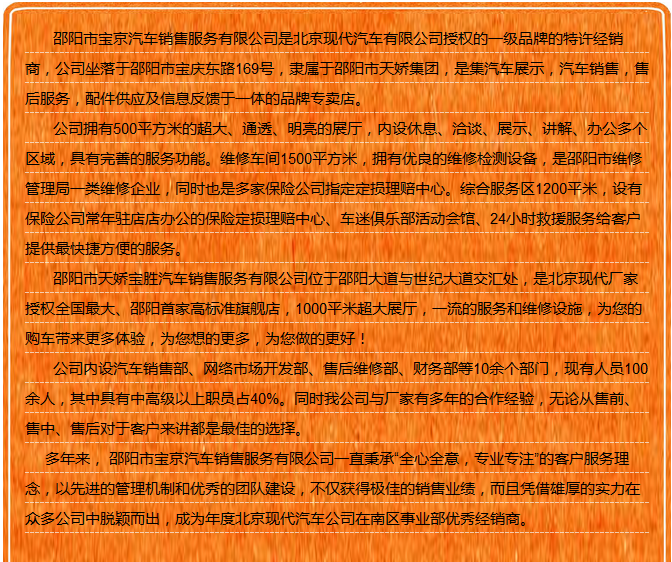 【915-918邵陽(yáng)秋季車展】 9月15日-9月18日,2017湘西南第二屆汽車文化節(jié)暨(北京現(xiàn)代領(lǐng)動(dòng))邵陽(yáng)秋季車展將于天嬌國(guó)際汽車城隆重舉辦。本屆車展由邵陽(yáng)市政府批準(zhǔn)、邵陽(yáng)市汽車行業(yè)商會(huì)主辦、北京現(xiàn)代領(lǐng)動(dòng)冠名,邵陽(yáng)順馳起亞、獵豹汽車、永馳東南汽車、邵陽(yáng)眾泰汽車、和昌長(zhǎng)安汽車、邵陽(yáng)三馬名車、天嬌福特、大漢通寶寶馬、邵陽(yáng)新奧奧迪協(xié)辦,合作銀行為:中國(guó)農(nóng)業(yè)銀行股份有限公司邵陽(yáng)分行。此次車展不僅僅是一場(chǎng)視覺(jué)的盛宴,更是一場(chǎng)震撼的汽車文化之旅!今天小編就給大家著重介紹一下此次車展冠名及協(xié)辦單位。