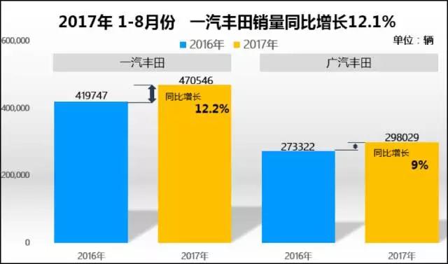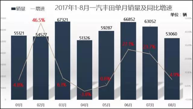 從上圖中我們不難看到從今年的1月份至8月份一汽豐田的銷量是處于一個(gè)比較穩(wěn)定的趨勢(shì)的,低的時(shí)候也有五萬(wàn)多。與去年1-8月份的銷量對(duì)比,同比增速也是處于一個(gè)穩(wěn)扎穩(wěn)打的狀態(tài)。截止至8月份,一汽豐田今年累計(jì)銷量已經(jīng)達(dá)到47萬(wàn)輛,對(duì)于全年67萬(wàn)輛的銷售目標(biāo)已經(jīng)完成了70%,可以說(shuō)達(dá)到目標(biāo)是輕而易舉的,剩下的銷量不成問(wèn)題。
