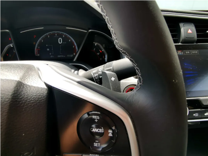 新款思域在老款的基礎(chǔ)上,新增了一套模擬換擋撥片,為駕駛體驗再添幾分姿色。儀表盤的整體造型不變,但儀表盤顏色由之前的藍(lán)色變?yōu)榧t色,表明了它的特殊身份。
